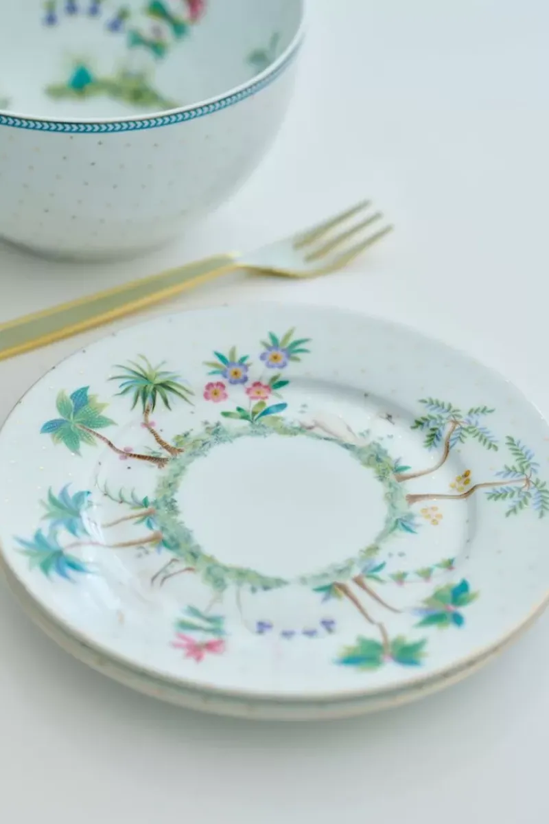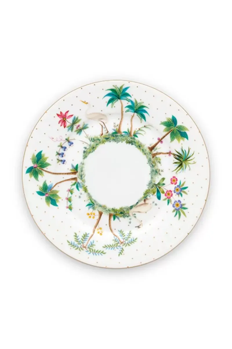 Dieser Weise Frühstücksteller Ist Perfekt Fur Ein Entspanntes Fruhstuck. Der Teller Ist Mit Goldenen Punkten Versehen. Bei Diesem Muster Werden Sie Sofort An Eine Tropische Insel Erinnert. In Der Mitte Sind Verschiedene Tropische Palmen, Blumen Und Pflanzen Zu Sehen. Fur Inspirationen Zum Kombinieren Dieses Tellers Beachten Sie Bitte Die Gesamte Jolie-Kollektion.