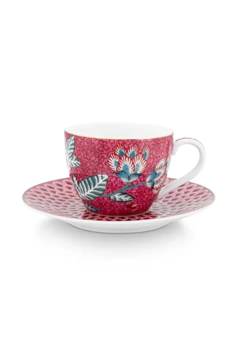 Geniesen Sie Ihren Espresso Mit Diese Tasse & Undertasse Aus Der Flower Festival Kollektion. Die Tasse Hat Ein Florales Design Mit Phantasievollen Roten Und Rosa Chintzbluten Mit Hellblauen Und Grunen Blattern Und Ist Mit Einem Muschel-Design Abgerundet.