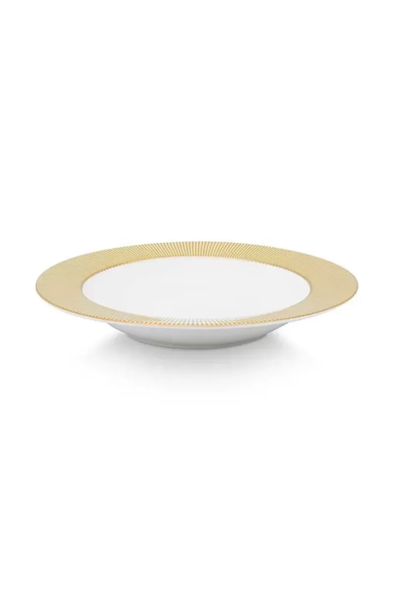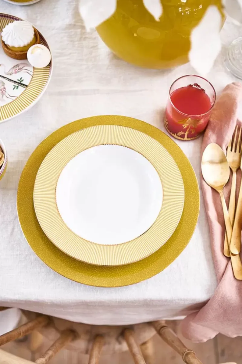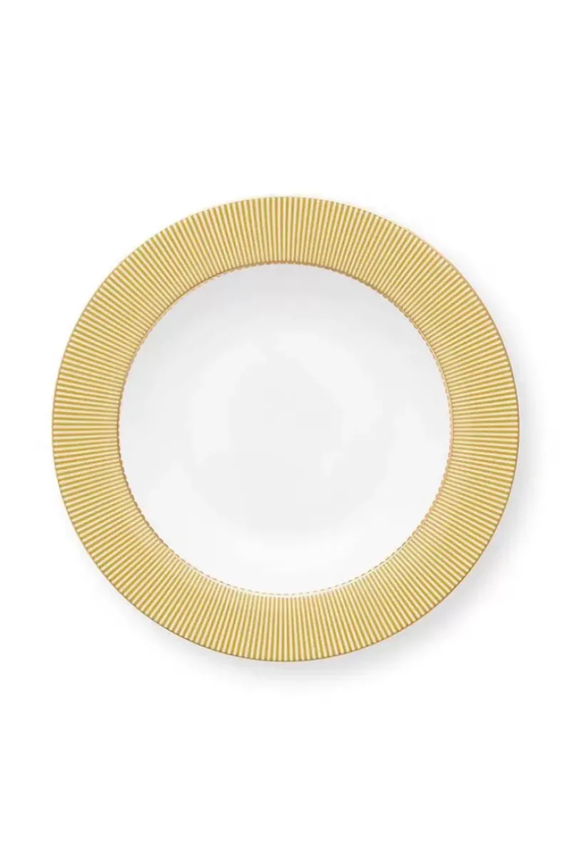 Dieser Gelb Tiefer Teller Wurde Aus Hochwertigem Porzellan Angefertigt Und Ist Mit Gelb Und Weisse Streifen Verziert. Jeder Rand Hat Goldene Details. Lasst Sich Hervorragend Mit Dem Ubrigen Essgeschirr Aus Der La Majorelle Kollektion Kombinieren.