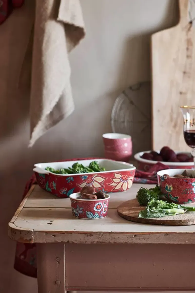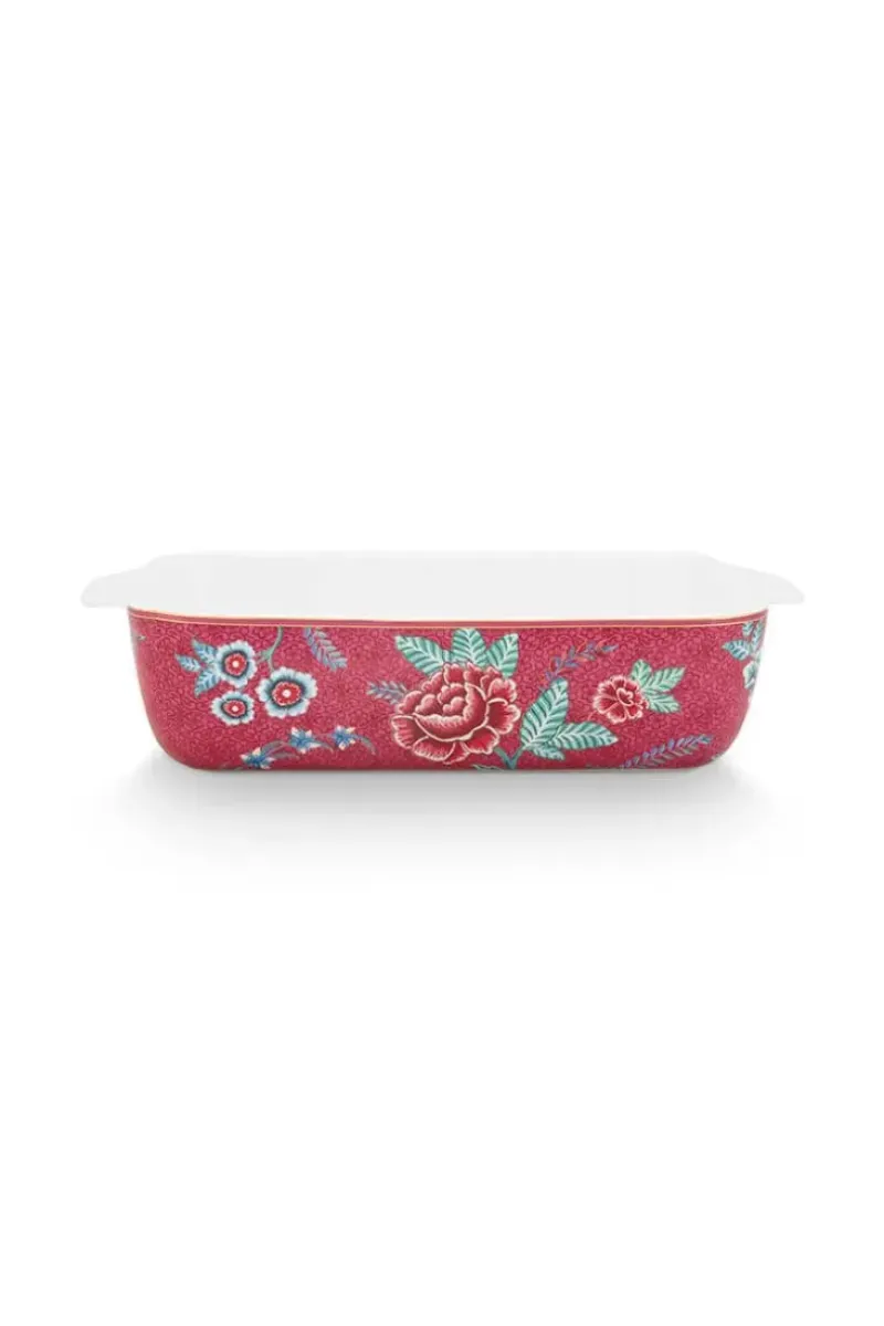 Backen Sie Ihre Geschirr Mit Diesem Rechteckige Auflaufform Aus Der Flower Festival Kollektion. Die Auflaufform Hat Ein Florales Design Mit Phantasievollen Roten Und Rosa Chintzbluten Mit Hellblauen Und Grunen Blattern.