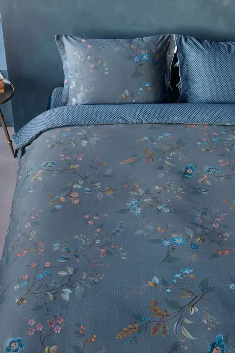 Dieser Schone Bettbezug In Blau Ist Mit Dem Kawai Flower-Design Bedruckt. Das Design Besteht Aus Eleganten Zweigen Und Fantasievollen Blumen. Die Bettbezug Hat Einen Gesteppten Rand, Einen Bindeverschluss Und Ist Mit Einem Flachen Rand Versehen. Die Ruckseite Ist Mit Einem Schleifenmuster Bedruckt, Sodass Die Bettbezug Beidseitig Verwendet Werden Kann.