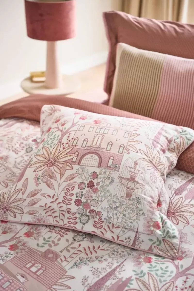 Das Quadratische Dekokissen Casa Di Pip Schmuckt Ein Frohliches Printmuster Mit Diversen Dekorierten Italienischen Hausern. Das Dekokissen Ist An Den Seiten Mit Einem Gesteppten Stehsaum Versehen, Der Ihm Ein Luxurioses Aussehen Verleiht. Die Ruckseite Ist Mit Einem Muster Aus Blumen Und Einem Gepolsterten Knopfverschluss Versehen, Wodurch Das Kissen Auf Beiden Seiten Verwendet Werden Kann Und Ein Verspielter Mix & Match-Effekt Auf Ihrem Bett Entsteht.
