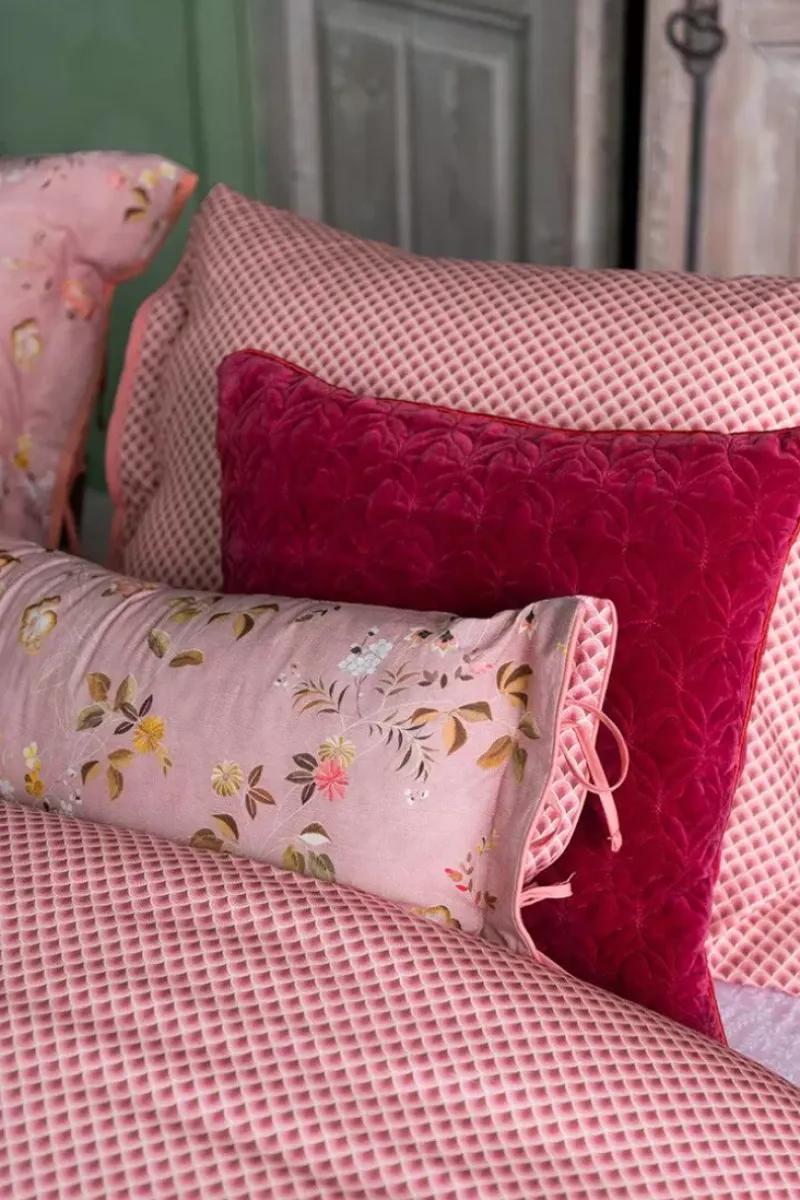 Das Frohliche, Hellrosa Quadratische Zierkissen Tokyo Blossom Hat Einen Detaillierten Print Aus Kleinen, Pastellfarbenen Bluten Und Blattern, Die Wie Gestickt Aussehen. Die Farben Des Kissenbezugs Sind Zart Mit Subtilen Farbakzenten. Der Untergrund Hat Eine Rosafarbene, Gedruckte Leinenstruktur.