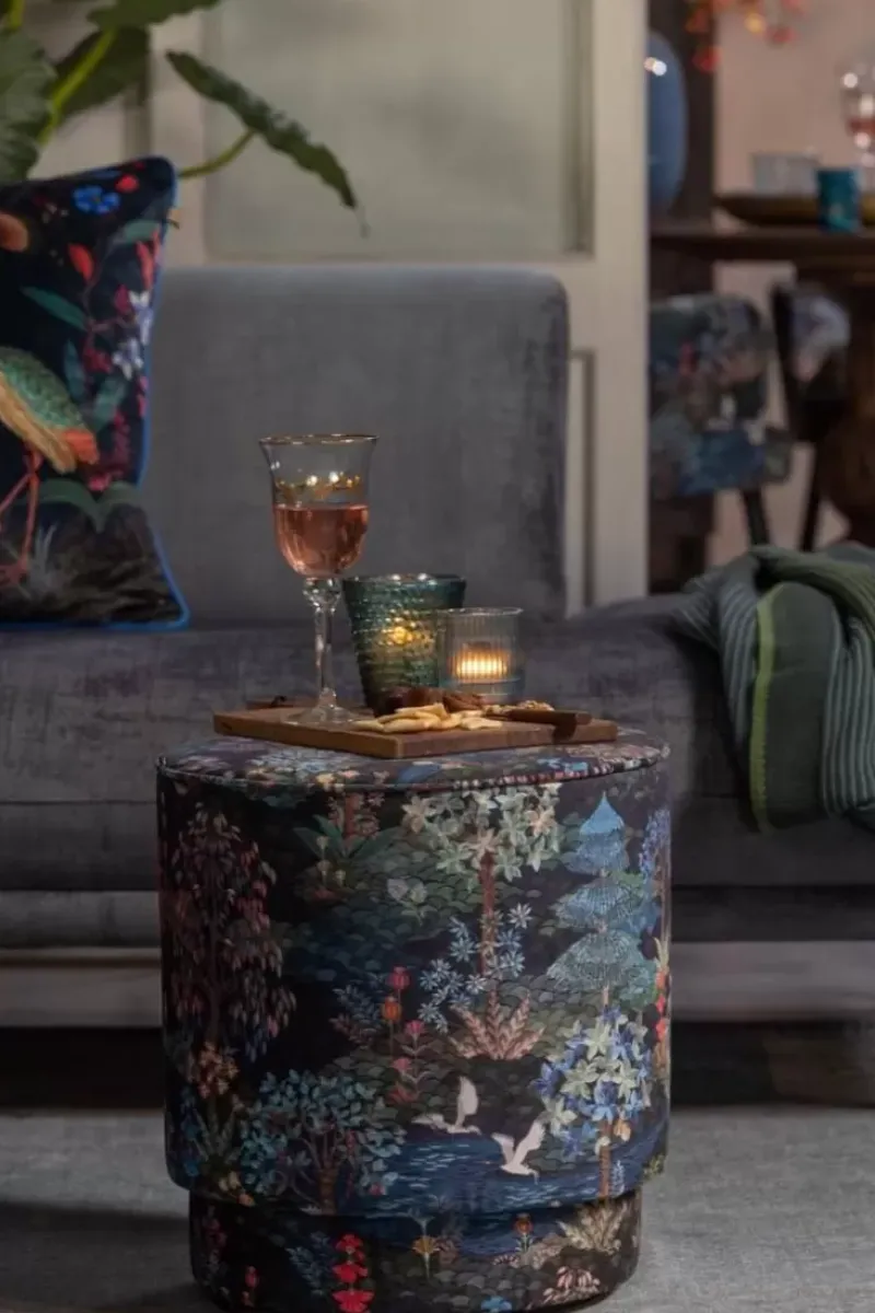 Der Pip Garden Hocker Medium In Dunkelblau Strahlt Etwas Marchenhaftes Aus. Das Design Bezaubert Durch Eine Vielfalt Fantasievoller Baume, Bunter Blumen Und Prachtiger Vogel. Kombinieren Sie Den Hocker Mit Dem Passenden Dunkelblauen Pip Garden Teppich, Um Einen Magischen Ort Zu Schaffen. Der Hocker Dient Als Extra Sitzgelegenheit Oder Hocker Zum Hochlegen Ihrer Beine.