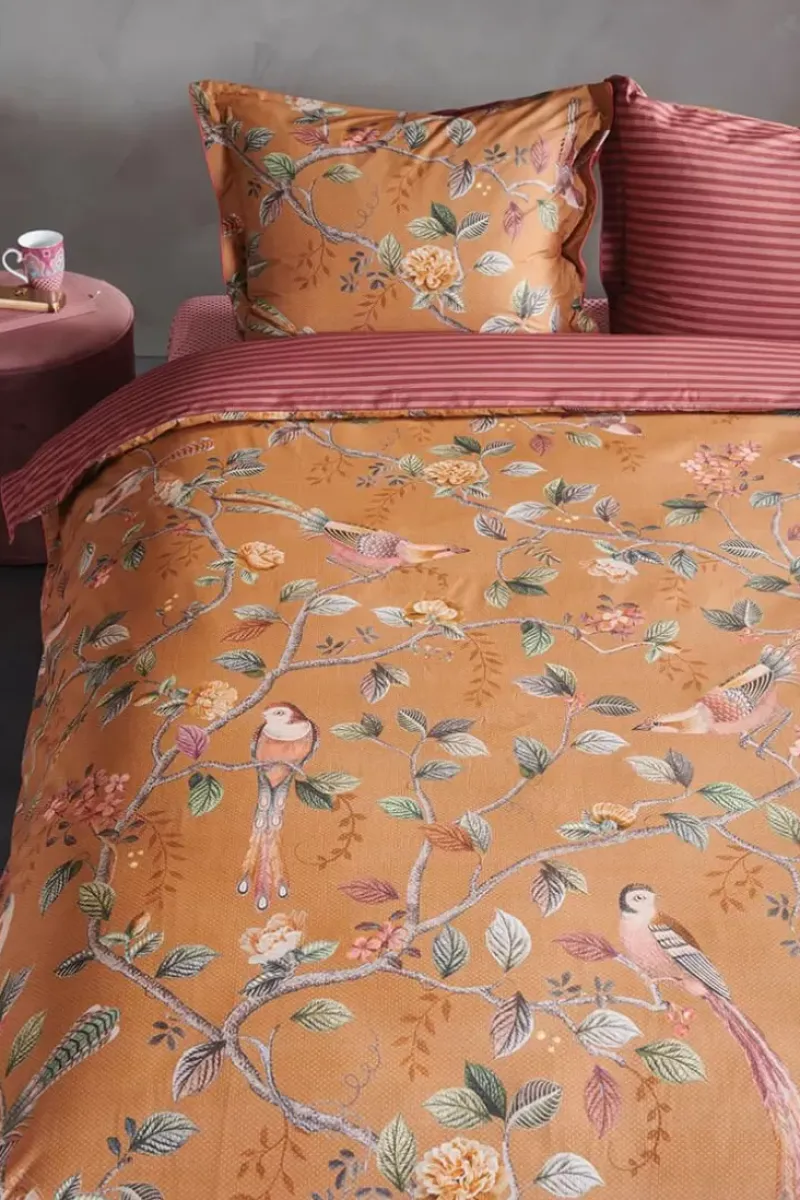 Dieser Kissenbezug In Gelb Ist Mit Dem Good Nightingale-Design Bedruckt. Dieser Druck Ist Zusammengestellt Aus Blumenzweigen Und Verschiedenen Arten Von Blumen Und Vogeln. Der Kissenbezug Hat Einen Gesteppten Rand, Einen Schleifenverschluss Und Ist Mit Einer Farbe Paspel Versehen. Die Ruckseite Ist Mit Einem Streifenmuster Bedruckt, So Dass Der Kissbezug Beidseitig Verwendet Werden Kann.