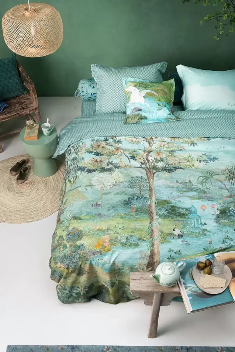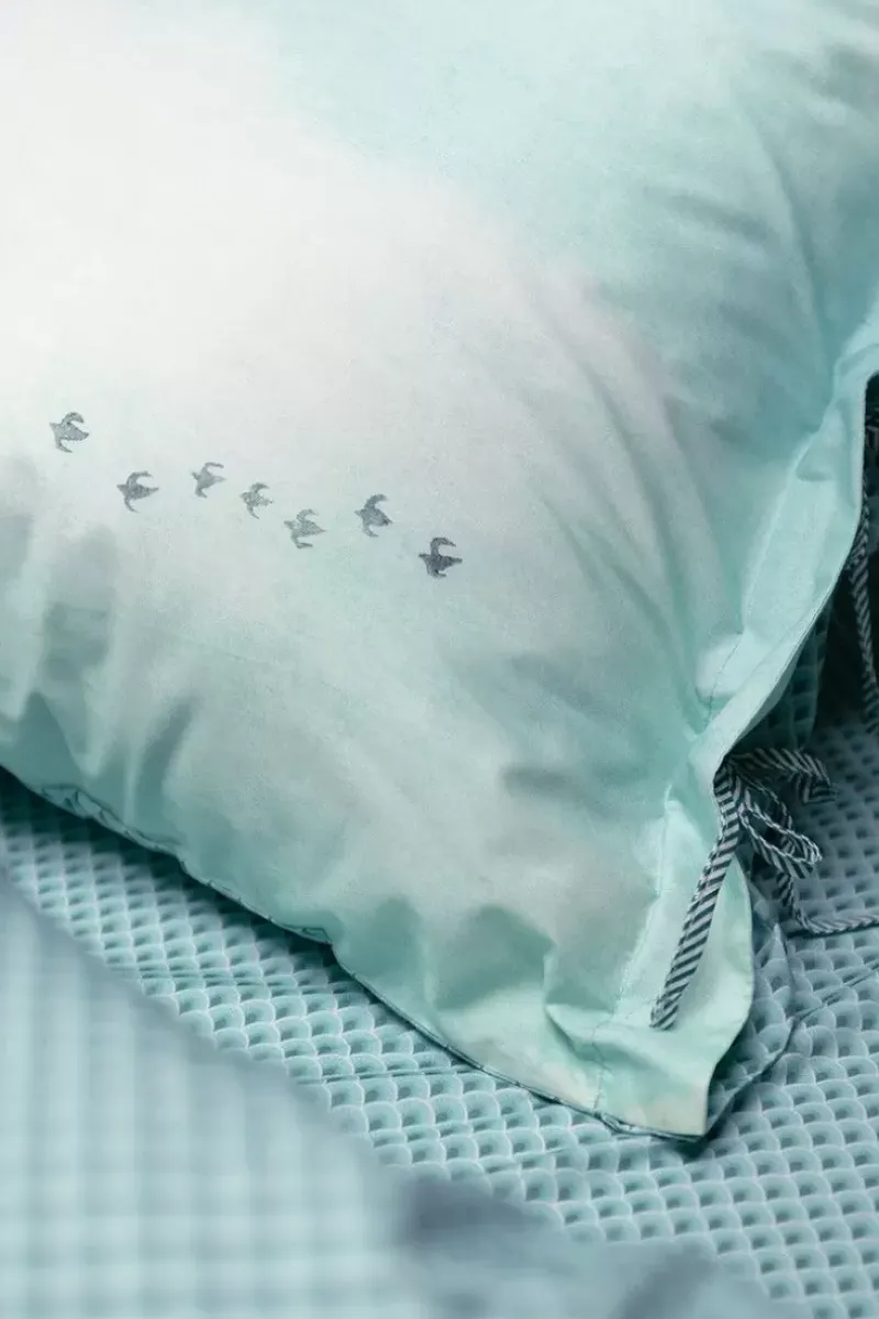 Als Inspiration Fur Den Grunen Kissenbezug Pip Paradise Dienen Die Malerischen Landschaften Japans. Auf Dem Design Ist Ein Zartgruner Himmel Zu Sehen, An Dem Einige Exotische Vogel Fliegen. Die Zarten Farben Verleihen Dem Kissenbezug Eine Exotische Und Zugleich Ruhige Ausstrahlung.