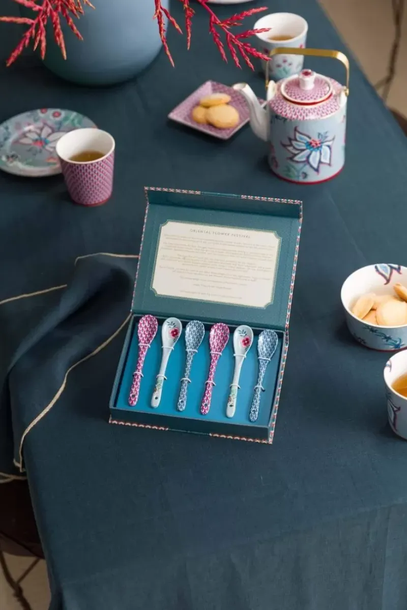 Erganze Dein Geschirr Mit Diesem Flower Festival Teeloffel. Dieses Set Aus 6 Verschiedenen Teeloffel Hat Einen Hellblauen Hintergrund Und Ist Mit Dem Eleganten Flower Festival Design Dekoriert. Dieses Reiche Blumenmuster Besteht Aus Einer Variation Fantasievoller Chintzblumen In Rot Und Rosa Mit Hellblauen Und Grunen Blattern. Die Spielerisch Platzierten Blutenzweige Mit Aufwendig Verzierten Bluten Und Blattern Machen Dieses Raffinierte Design Zu Einem Besonders Reichen Erlebnis. Unser Flower Festival Porzellan Wird In Ihrem Geschirrschrank Und Auf Ihrem Tisch Strahlen.
