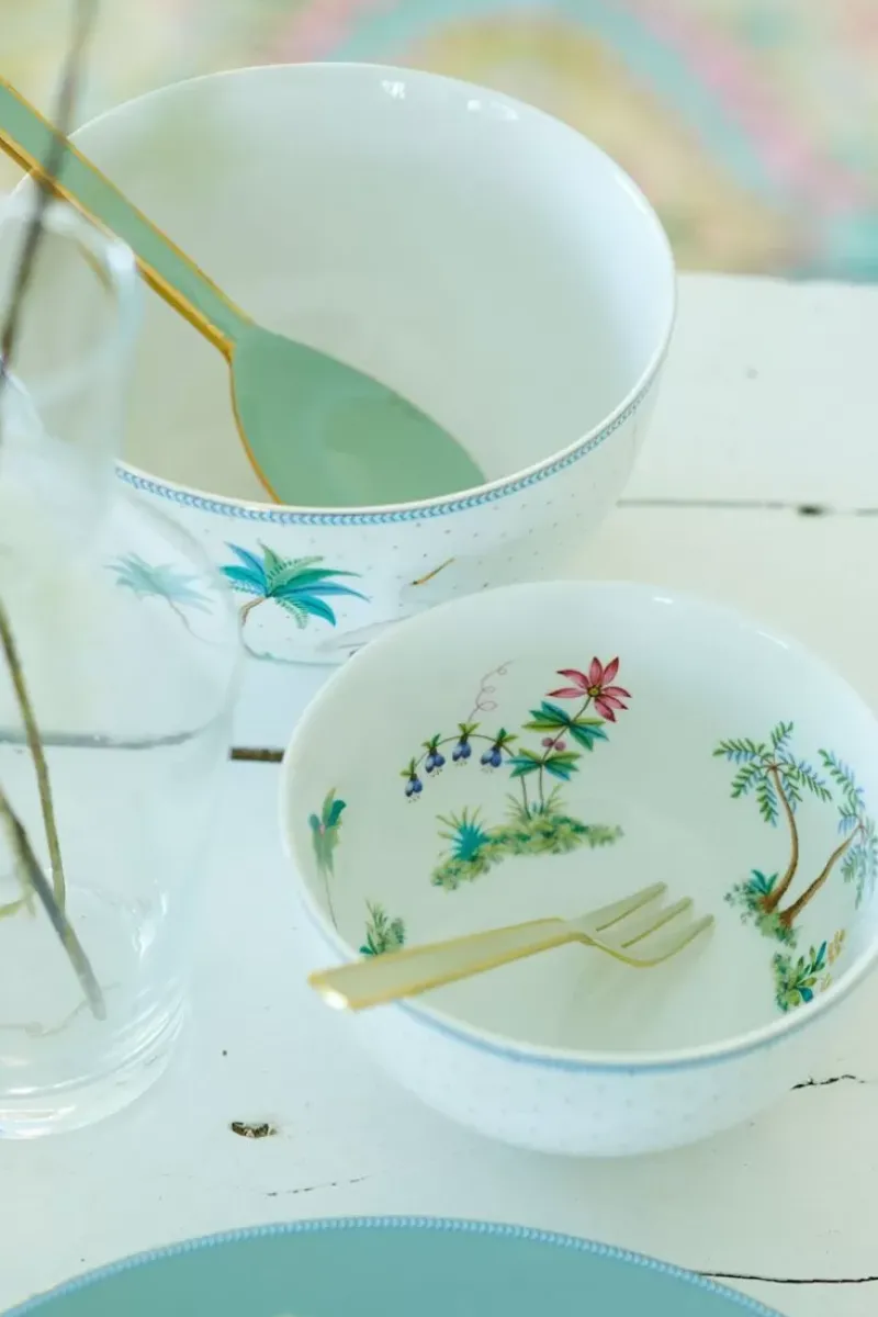 Diese Schone Schale Hat Einen Weisen Hintergrund Mit Goldenen Punkten Und Blauen Details. Am Rand Befindet Sich Eine Blaue Linie. Im Inneren Der Schale Befinden Sich Verschiedene Exotische Pflanzen Und Palmen, So Dass Man Sich Gleich Wie In Den Tropen Fuhlt. Auch In 18 Cm Erhaltlich. Fur Inspirationen Zum Kombinieren Dieser Schale Beachten Sie Bitte Unsere Jolie-Kollektion.