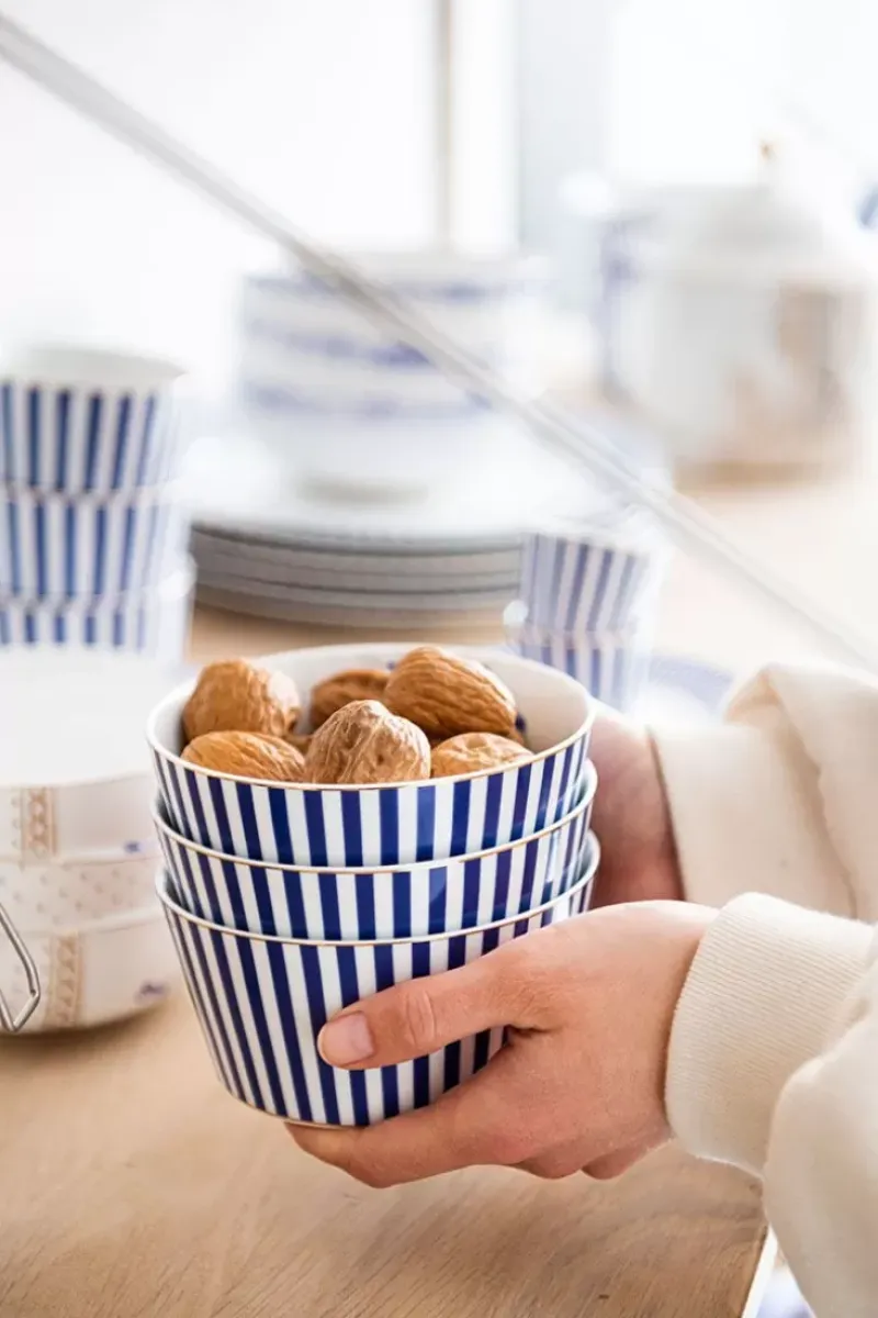Diese Gestreifte Porzellanschale Ist Mit Dem Muster Royal Stripes Versehen. Im Inneren Der Schale Befinden Sich Blau Gemalte Bluten, Die Dem Eierbecher Eine Frische Und Elegante Note Verleihen. Auserdem Ist Die Schale Mit Goldenen Details Versehen Und Passt Perfekt Zu Den Anderen Teilen Dieser Kollektion. Auch In 15 Cm Erhaltlich.