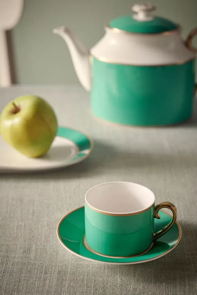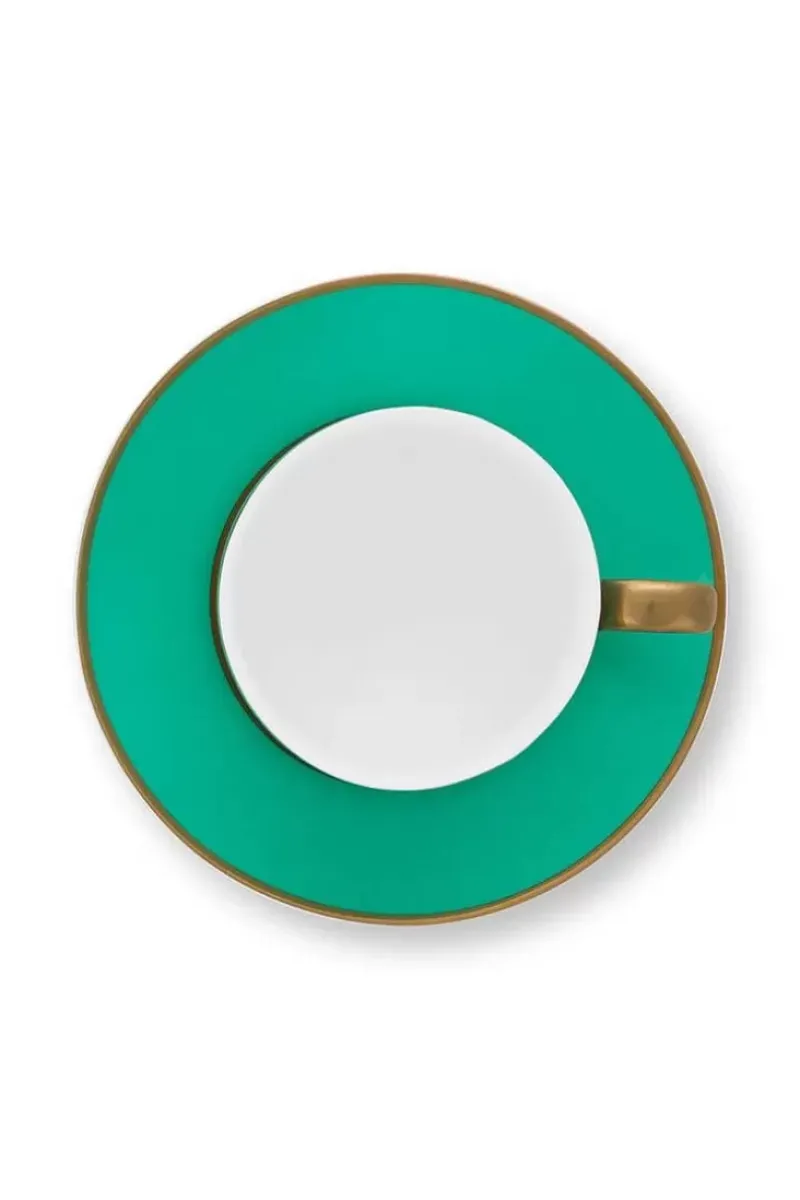 Eine Grune Cappuccinotasse Mit Untertasse Aus Der Pip Chique Kollektion. Verziert Mit Einem Goldfarbenen Rand. Jede Tasse Ist Mit Luxuriosen Elementen Wie Goldenen Details Am Henkel Versehen. Perfekt Zu Kombinieren Mit Den Anderen Artikeln Von Pip Chique Grun Und Rosa. Das Porzellan Besteht Aus Bone China, Einem Hochwertigen, Dunnen Porzellan Mit Einem Raffinierten Design. Auch In 120 Ml Erhaltlich.