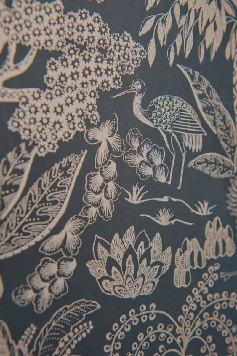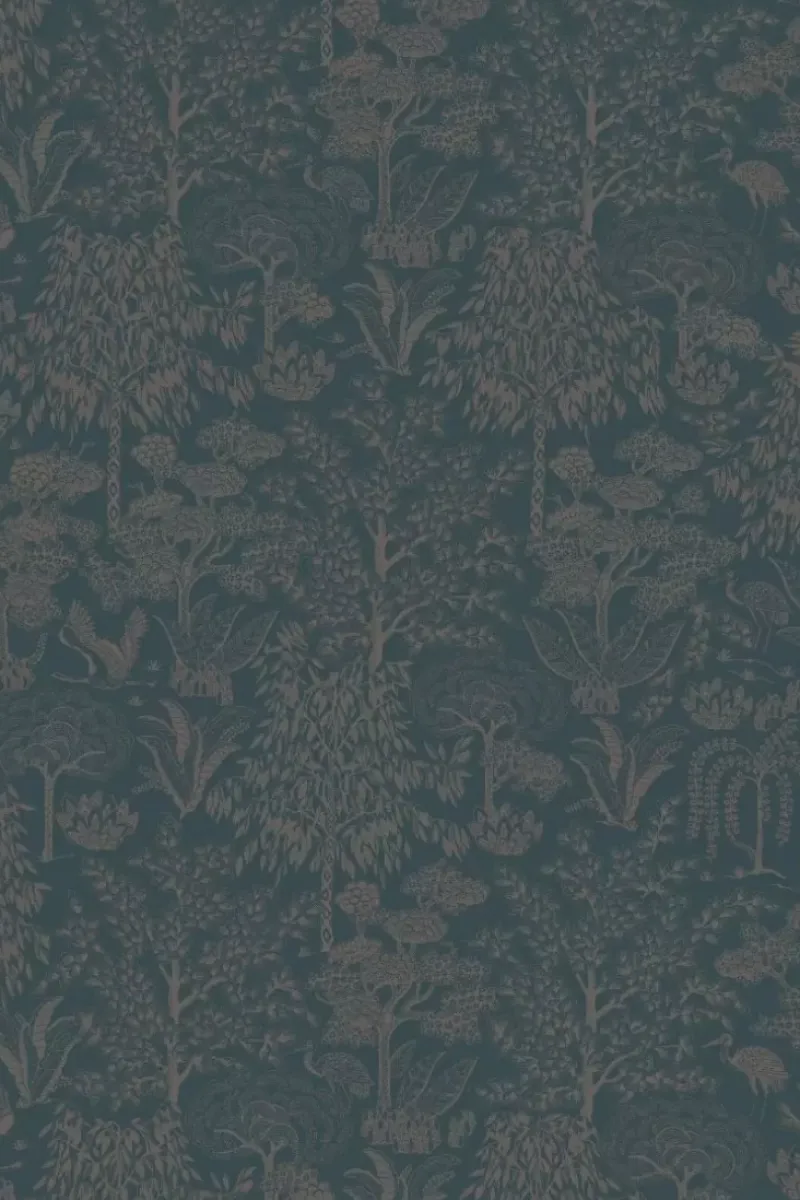Gib Deinem Zuhause Ein Zauberhaftes Makeover Mit Der Wunderschonen Origami Tapete In Der Farbe Dunkelblau/Rosegold. Das Design Hat Ein Sich Wiederholendes Muster Aus Stilisierten Baumen Und Vogeln. Der Matte Hintergrund Mit Metallic-Print Verleiht Der Tapete Einen Besonderen Und Raffinierten Look. Die Origami Tapete Ist In Verschiedenen Farben Erhaltlich: Hellgrun/Silber, Ocker/Gold, Terra/Rosegold Und Gebrochen Weiss/Silber.