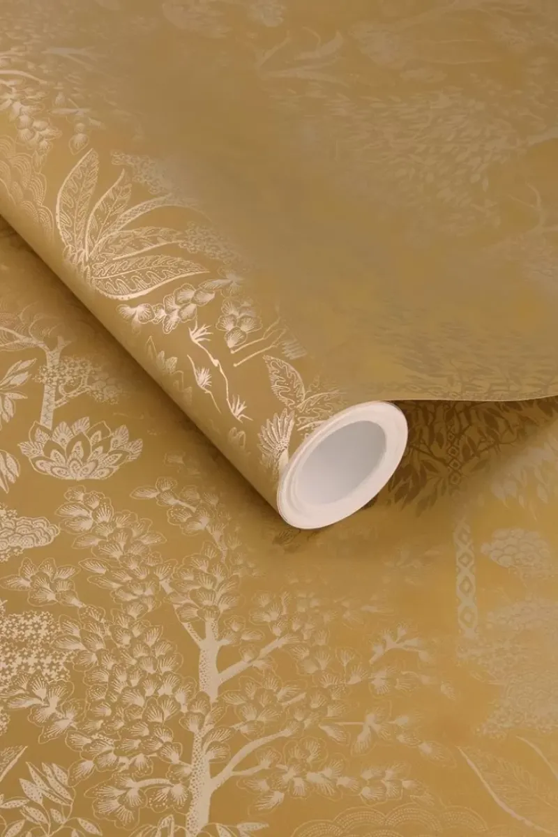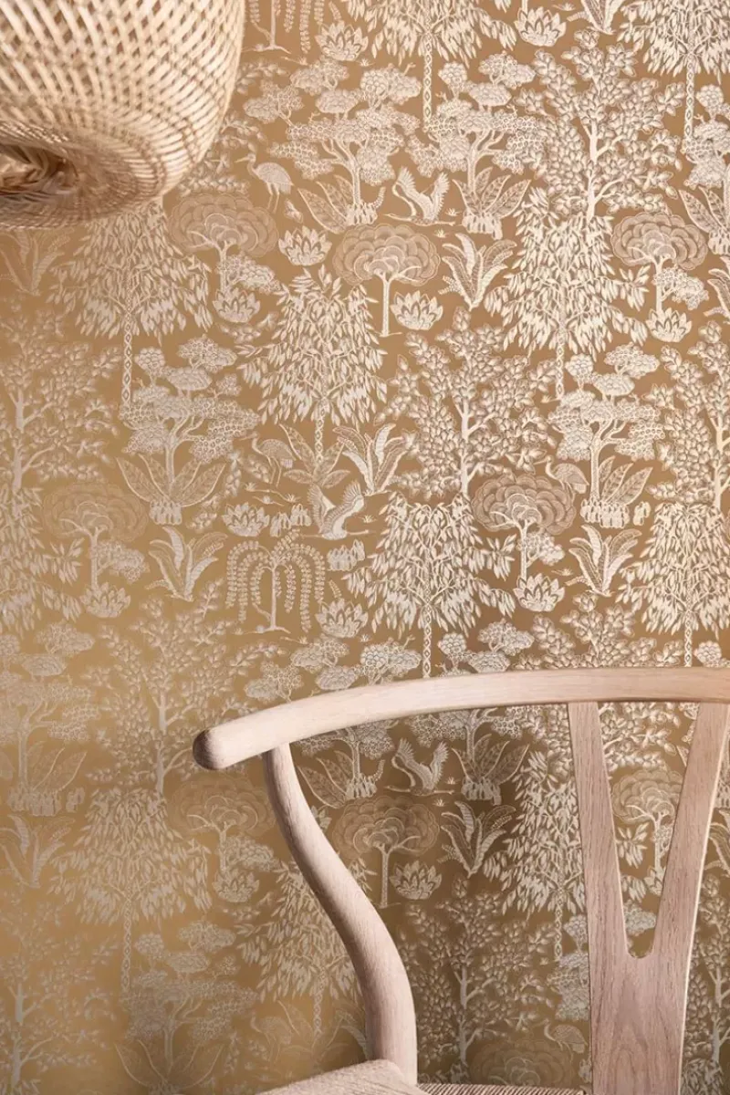 Gib Deinem Zuhause Ein Zauberhaftes Makeover Mit Der Wunderschonen Origami Tapete In Der Farbe Ocker/Gold. Das Design Hat Ein Sich Wiederholendes Muster Aus Stilisierten Baumen Und Vogeln. Der Matte Hintergrund Mit Metallic-Print Verleiht Der Tapete Einen Besonderen Und Raffinierten Look. Die Origami Tapete Ist In Verschiedenen Farben Erhaltlich: Hellgrun/Silber, Gebrochen Weiss/Silber, Terra/Rosegold Und Dunkelblau/Rosegold.