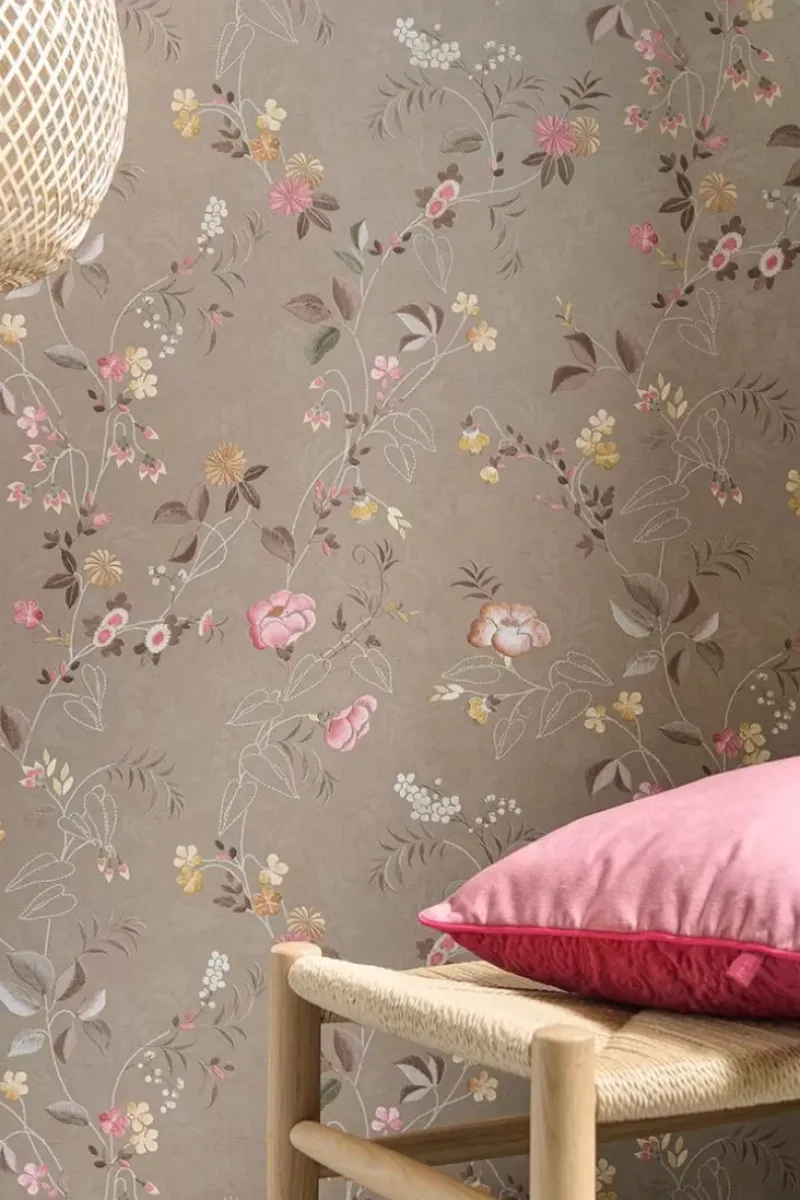 Gib Deinem Zuhause Ein Zauberhaftes Makeover Mit Der Wunderschonen Tokyo Blossom Tapete In Der Farbe Khaki. Das Design Hat Einen Detaillierten Print Aus Kleinen, Pastellfarbenen Bluten Und Blattern, Die Wie Gestickt Aussehen. Die Farben Des Kissenbezugs Sind Zart Mit Subtilen Farbakzenten. Der Hintergrund Hat Eine Gedruckte, Glanzende Textur, So Dass Diese Tapete Wie Echte Seide Wirkt. Die Tokyo Blossom Tapete Ist In Verschiedenen Farben Erhaltlich: Jade Grun, Senfgelb, Sand Und Rosa Mauve.
