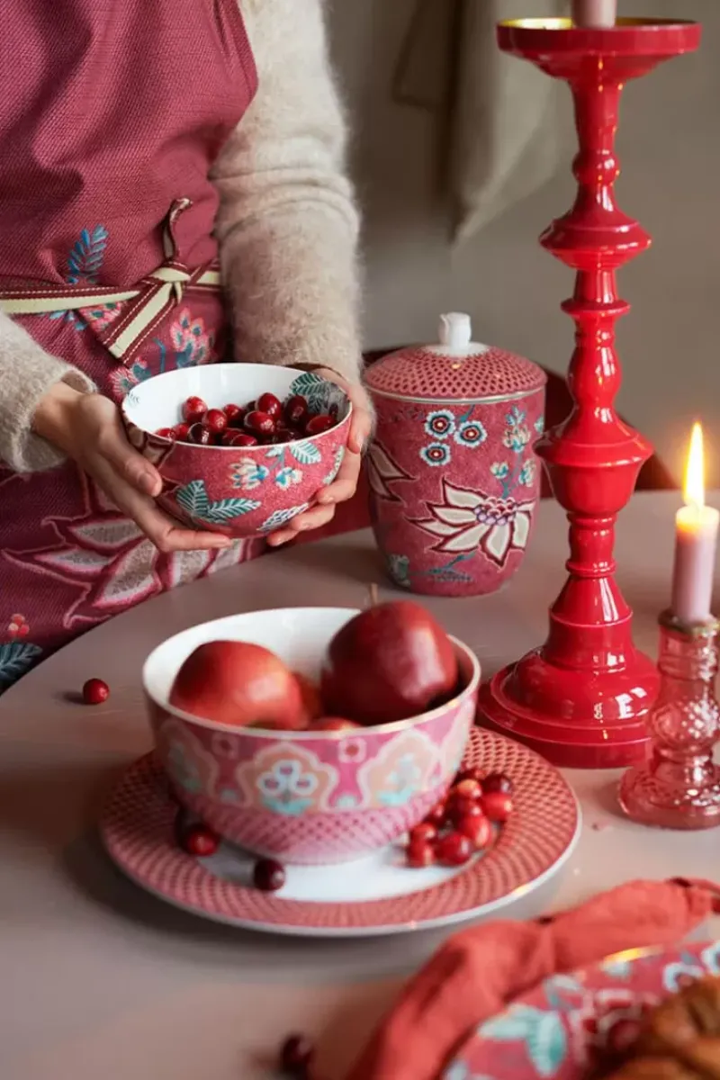 Verschonern Sie Ihren Tisch Mit Diese Vorratsdose Aus Der Flower Festival Kollektion. Das Vorratsdose Hat Ein Florales Design Mit Phantasievollen Roten Und Rosa Chintzbluten Mit Hellblauen Und Grunen Blattern Und Ist Mit Einem Muschel-Design Abgerundet.